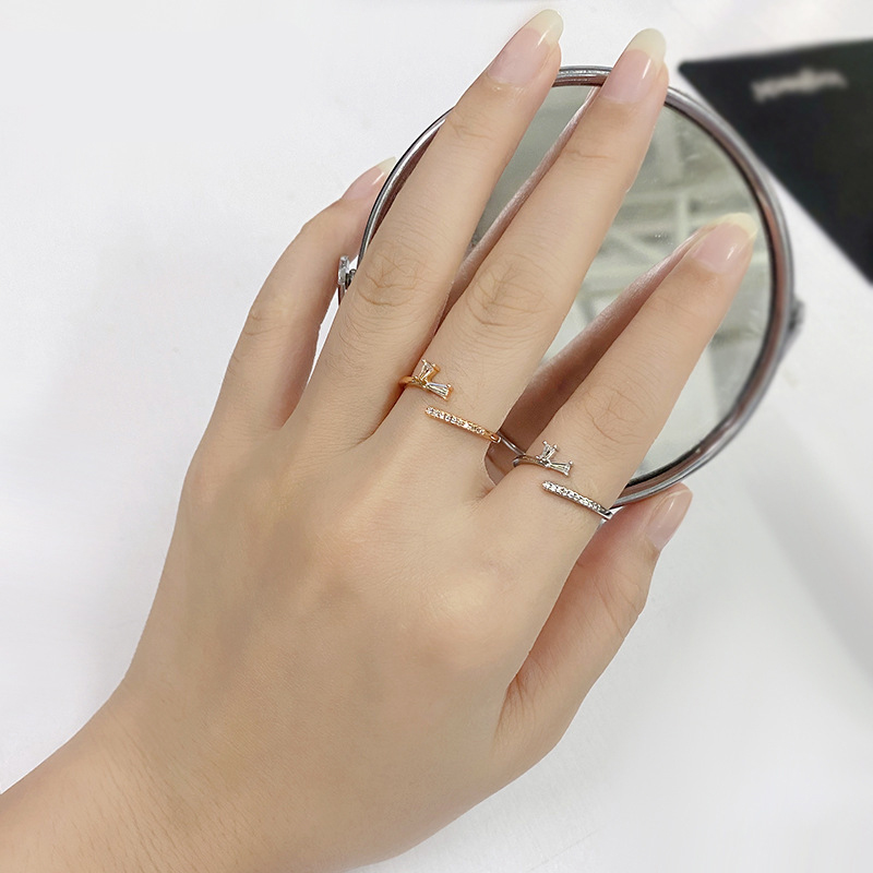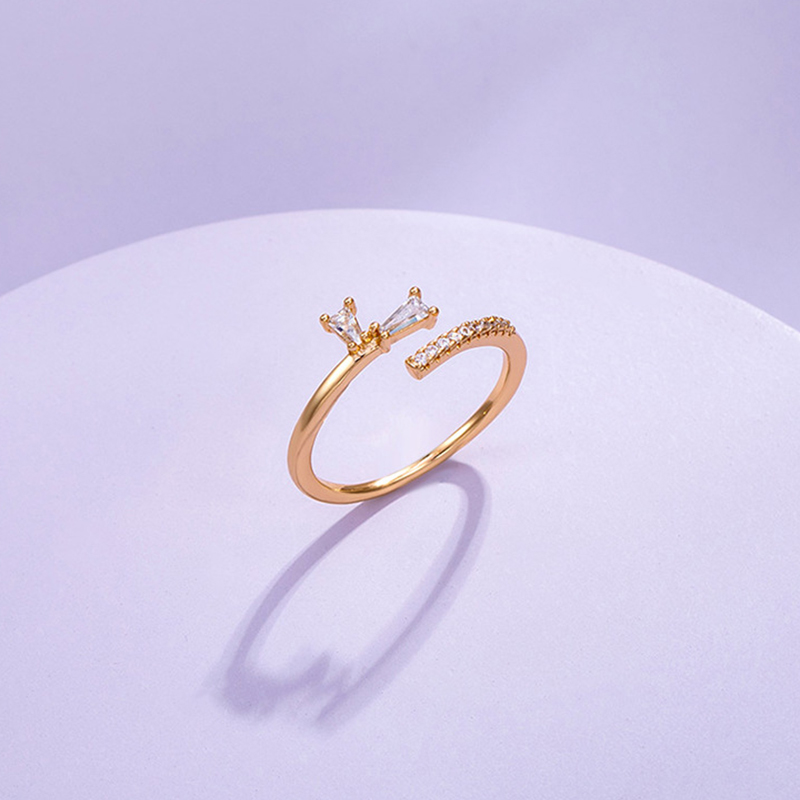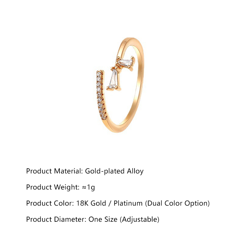 Mixed-Cut Contrast The clean, linear brilliance of baguette-cut stones is balanced by the soft shimmer of round pavé-set crystals, creating a dynamic interplay of shapes, texture, and light. Architectural Silhouette Designed with an open, bypass form, the ring wraps gracefully around the finger without fully meeting, giving it a refined, floating appearance with modern edge. Everyday Versatility Finished in a warm gold tone inspired by classic 18K hues, the adjustable open band offers gentle flexibility, making it easy to style across different fingers and everyday stacks.THE SPECS