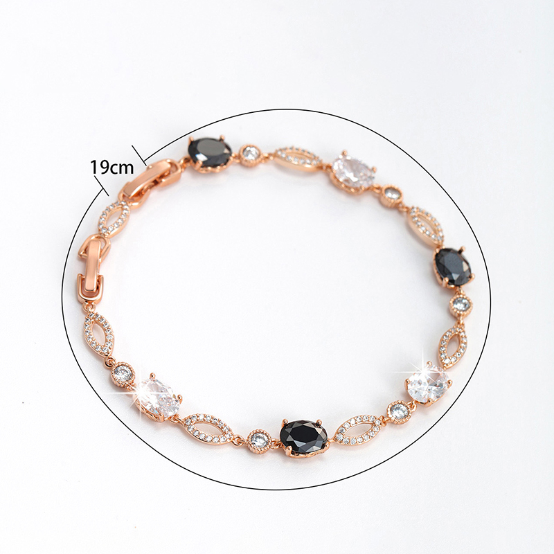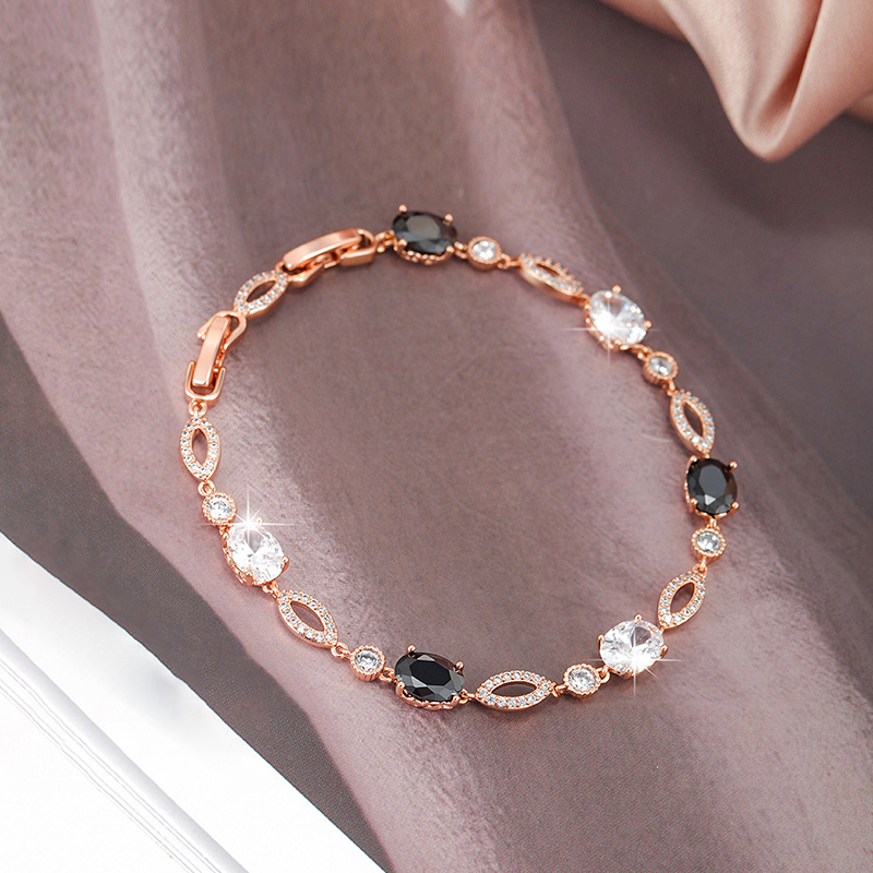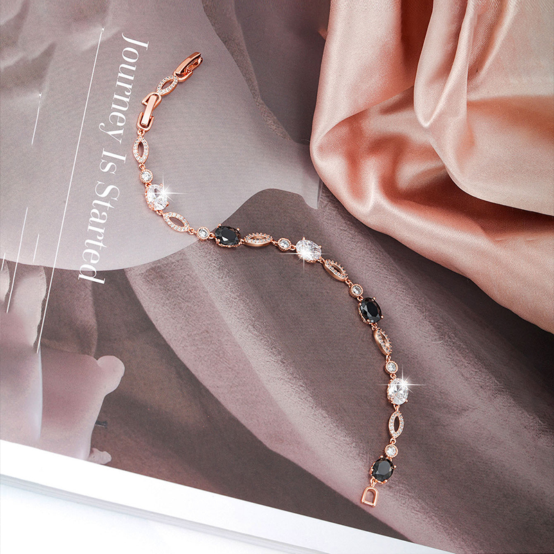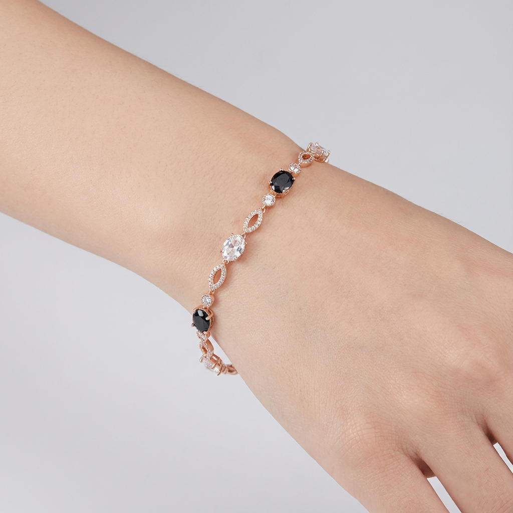Monochrome Contrast The interplay between jet-black oval crystals and bright clear stones creates a bold, graphic effect inspired by classic Art Deco styling— confident, polished, and endlessly wearable. Soft Rose Gold Tone Finished in a gentle rose gold tone, the warm blush hue adds softness and balance, beautifully offsetting the depth and intensity of the black crystals. Fluid Movement The articulated link construction allows the bracelet to drape smoothly across the wrist, offering a flexible, comfortable feel designed for all-day wear.THE SPECS