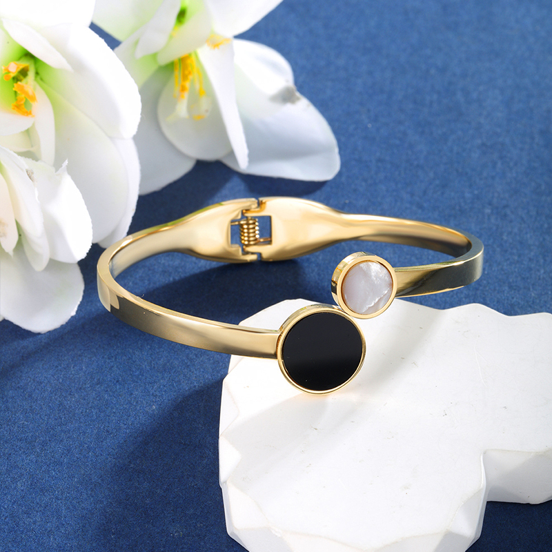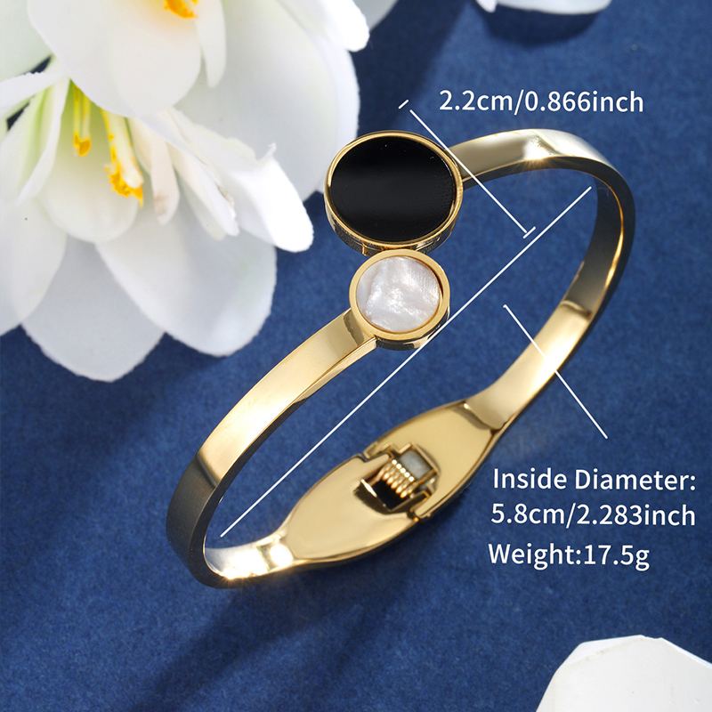 Everyday Durability Made from stainless steel with a warm gold-tone finish, this bangle is designed to withstand daily wear, maintaining its shine with minimal maintenance. Artistic Contrast The pairing of opaque black with iridescent white shell-style inlay creates a clean, graphic contrast inspired by balance and duality, resulting in a confident, architectural look. Secure & Comfortable Fit A discreet spring-hinge mechanism allows the bangle to open smoothly for easy wear, then close securely to sit comfortably on the wrist throughout the day.THE SPECS