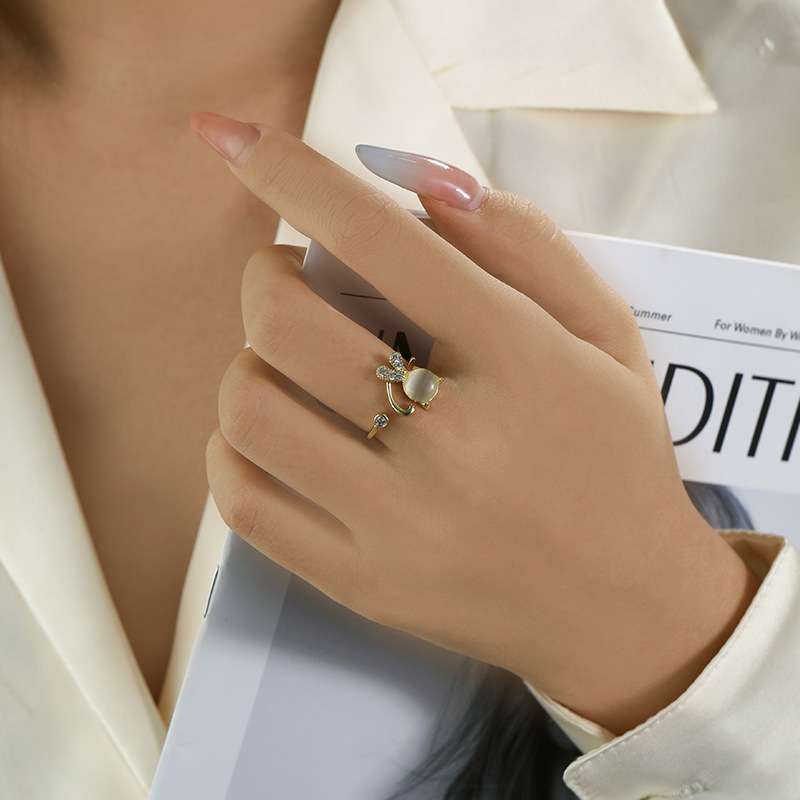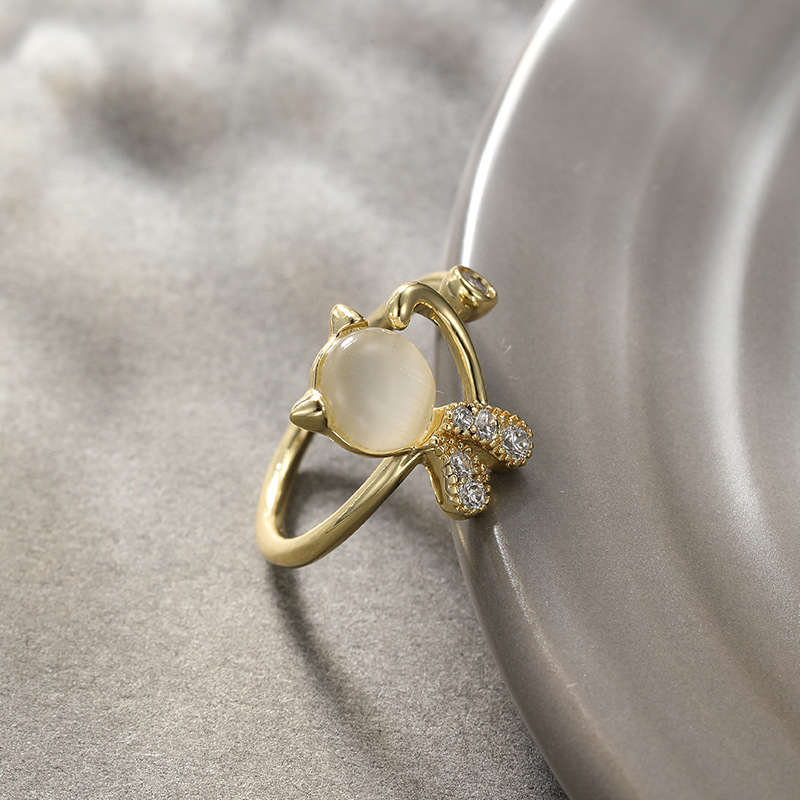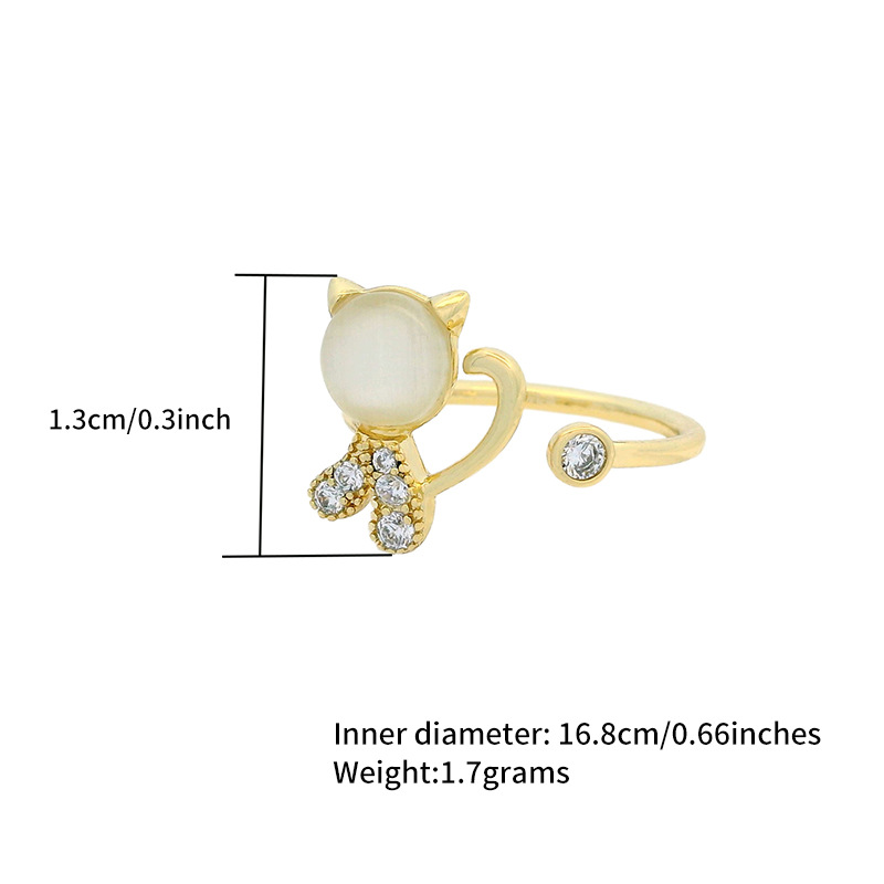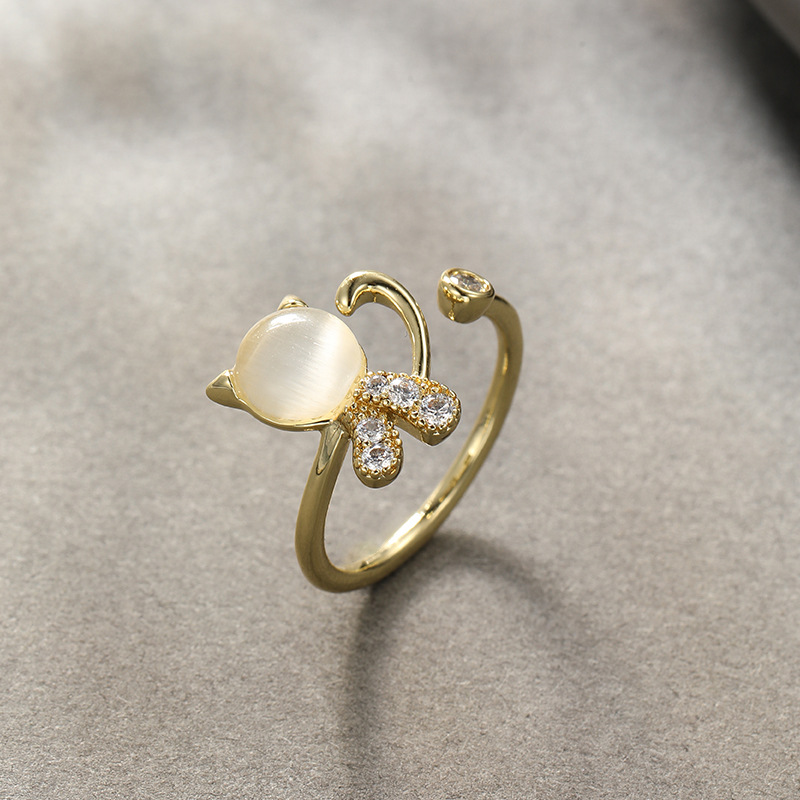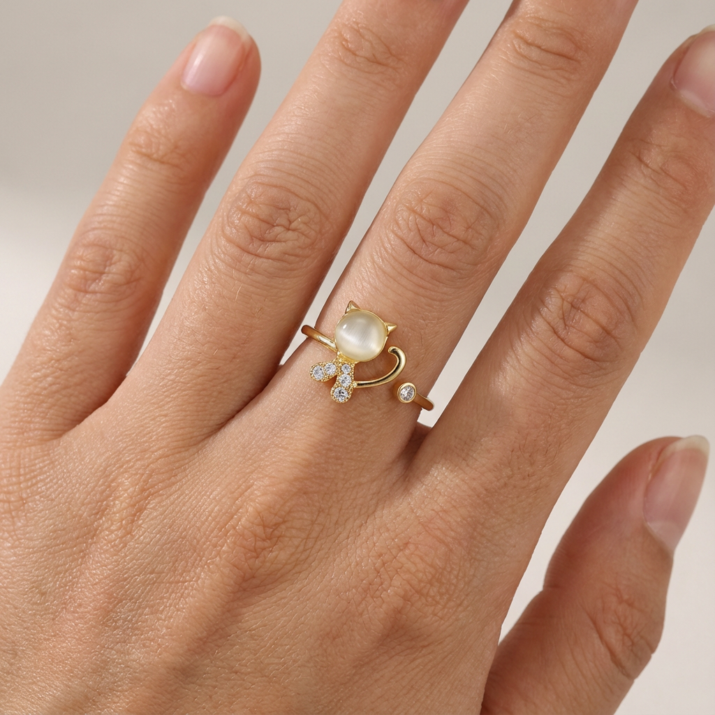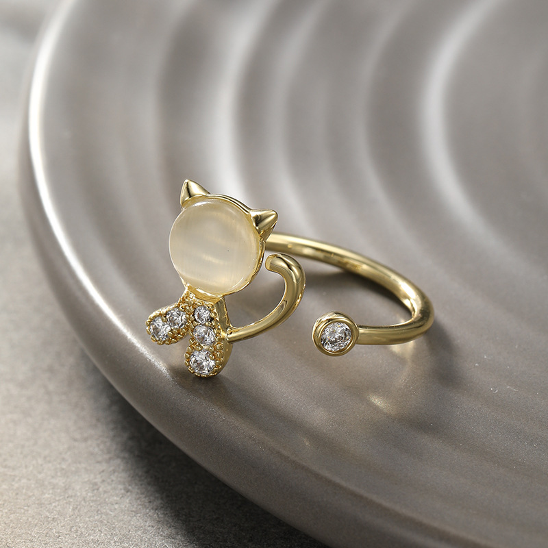 Signature Cat’s Eye Glow The centre stone is crafted in a synthetic cat’s eye style, displaying a soft, shifting band of light that creates a captivating, mystical glow reminiscent of a cat’s gaze. Thoughtful Whimsy Subtle details—including tiny gold ears and pavé-set crystal accents— add personality and charm, keeping the design sweet without feeling childish. Easy, Comfortable Wear Finished with a gold-tone open band, the ring offers gentle flexibility for a comfortable fit, making it ideal for everyday styling.THE SPECS