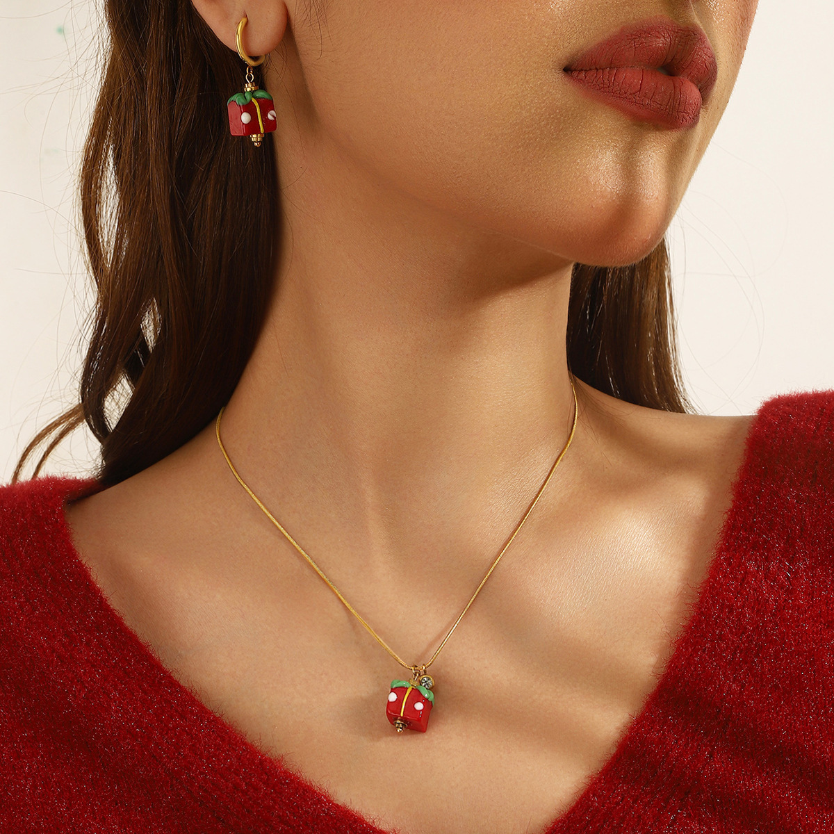 The necklace showcases a beautifully detailed gift box pendant, finished in a vibrant red hue that captures the festive spirit of the season. The smooth snake chain complements the charm with its subtle, modern gleam, creating an elegant piece that transitions effortlessly from casual daytime wear to evening holiday gatherings. Its minimalist design makes it perfect for solo wear or for layering with other necklaces.