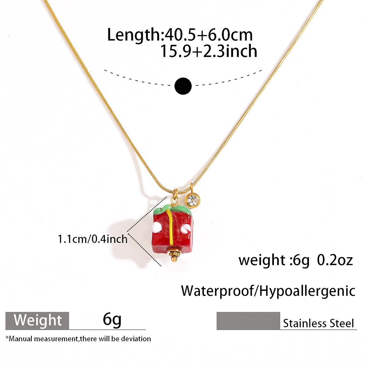 Celebrate the joy of giving with our Christmas Necklace, featuring a delicate red gift box charm suspended from a sleek snake chain. Crafted entirely from premium 316 stainless steel, this necklace offers exceptional durability and a hypoallergenic wearing experience. The lightweight 6g design ensures all-day comfort, while the adjustable 41cm+6cm length provides a perfect, customizable fit for any neckline.