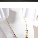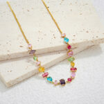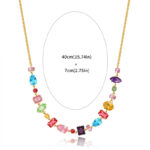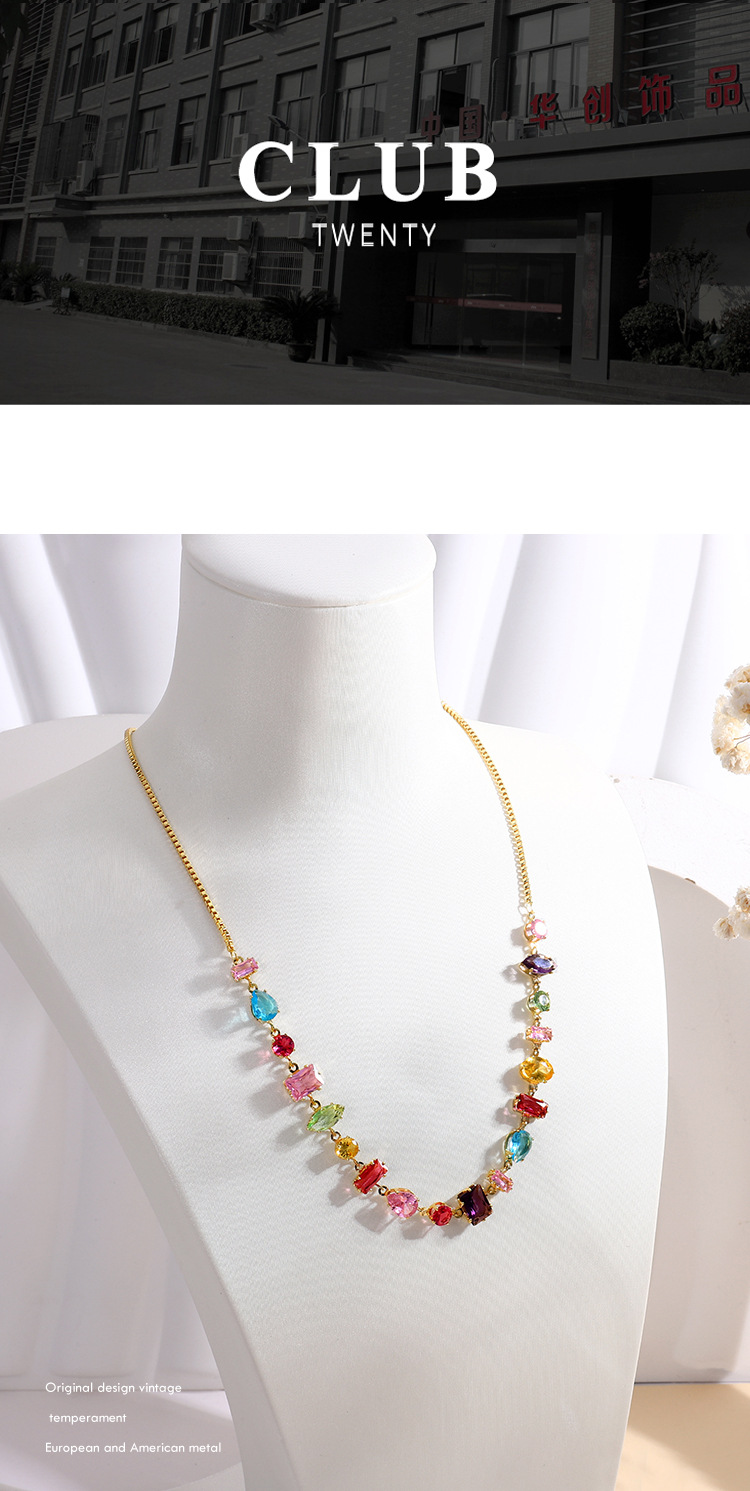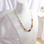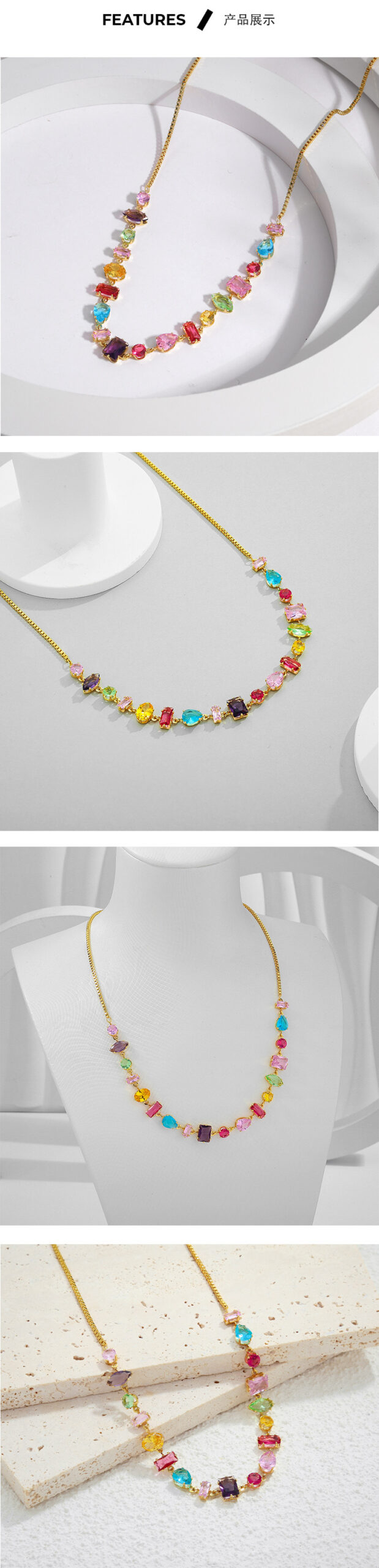 Make a statement with the Chroma Cascade Gemstone Necklace, designed to catch the light—and the eye. Featuring a cascade of colorful zircon stones on a gold-tone chain, this piece brings playful elegance to your neckline. Whether layered or worn solo, it adds a vibrant sparkle to both day and evening looks.