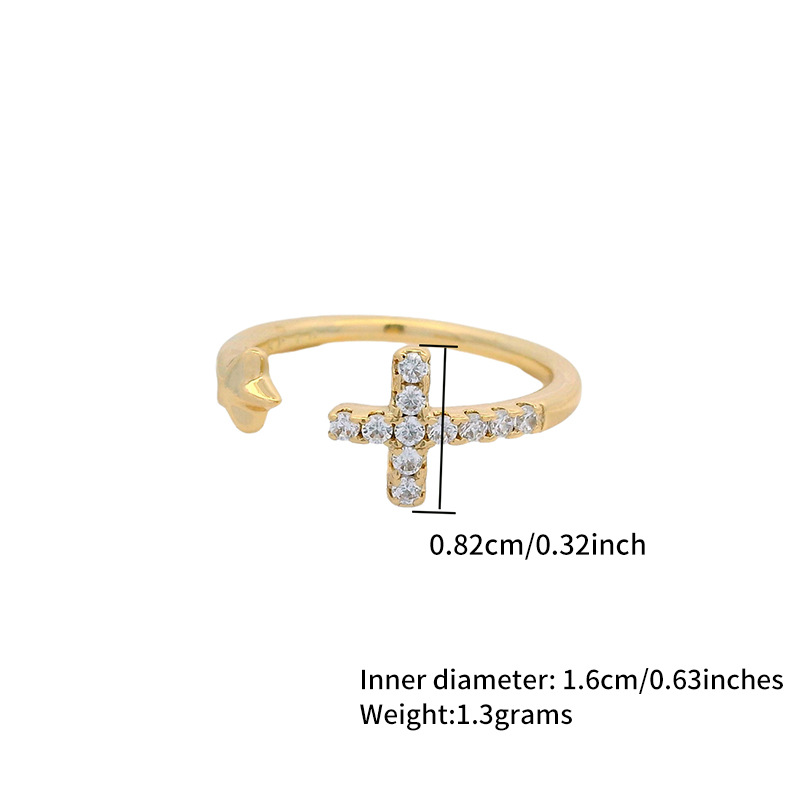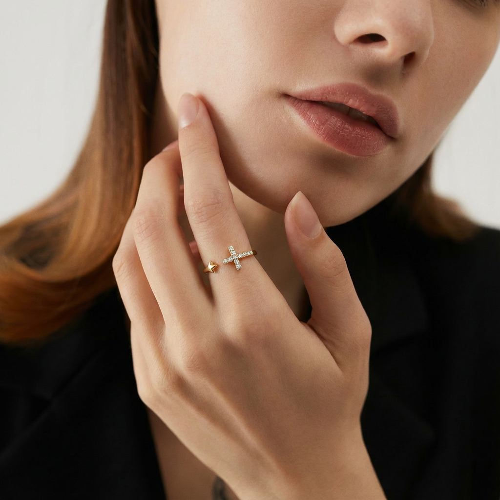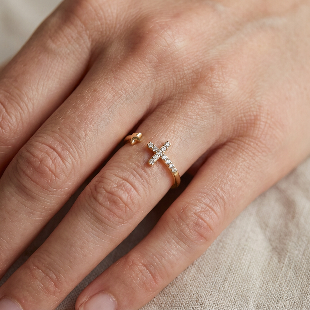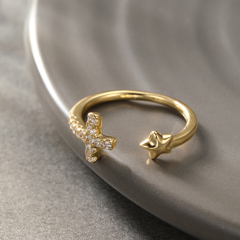 Meaningful Duo The cross symbolises protection and faith, while the star represents guidance and possibility. Together, they form a subtle, thoughtful design that carries personal meaning without feeling overstated. Petite by Design Created with a smaller open band, this ring is ideal for pinky or midi wear. The adjustable silhouette allows for gentle flexibility while maintaining its delicate proportions. Soft, Everyday Sparkle Tiny pavé-set crystals add a refined shimmer to the cross, offering just enough sparkle for daily styling.THE SPECS