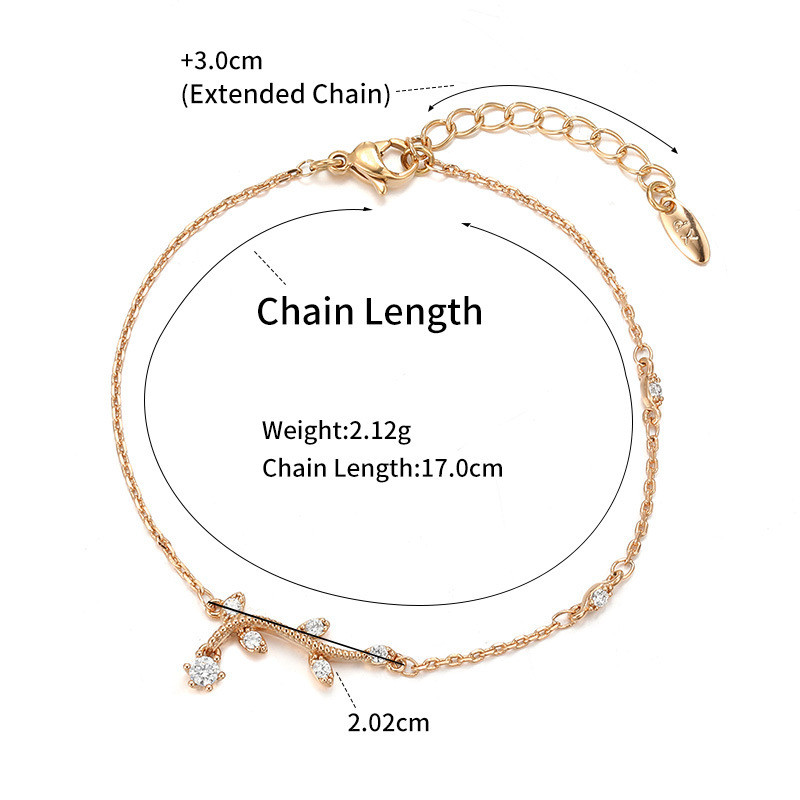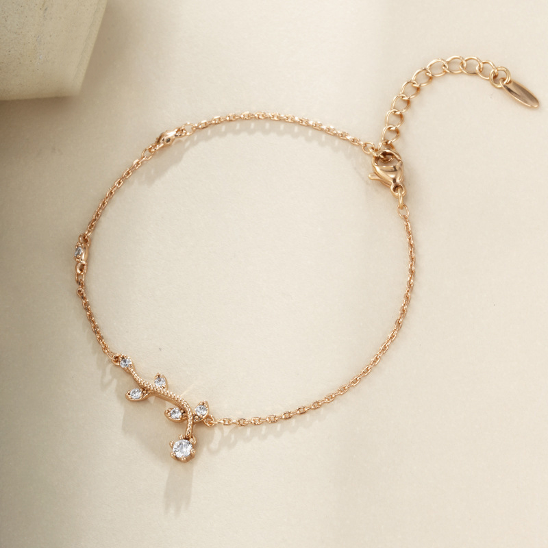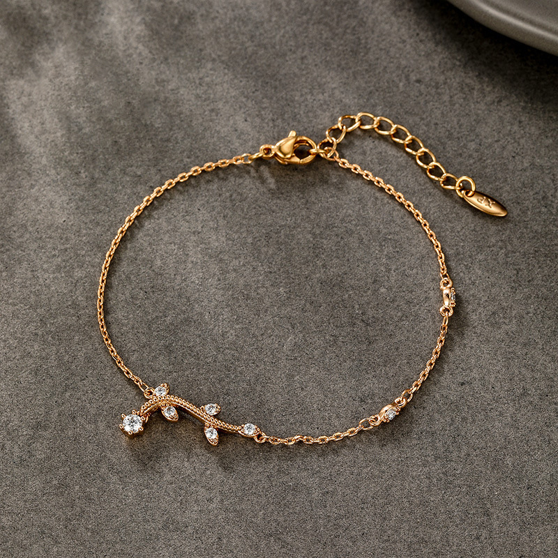 Organic Silhouette The gently curved branch motif follows the natural line of the wrist, creating an elegant, nature-inspired shape that feels fluid, balanced, and timeless. Soft Sparkle A mix of tiny round and marquise-cut crystals is set along the branch and delicately spaced along the chain, catching the light like morning dew on fresh leaves. Everyday Delicacy Finished with an ultra-fine chain, this bracelet is designed to feel lightweight and comfortable— ideal for wearing alone or layered alongside a watch or other delicate bracelets.THE SPECS