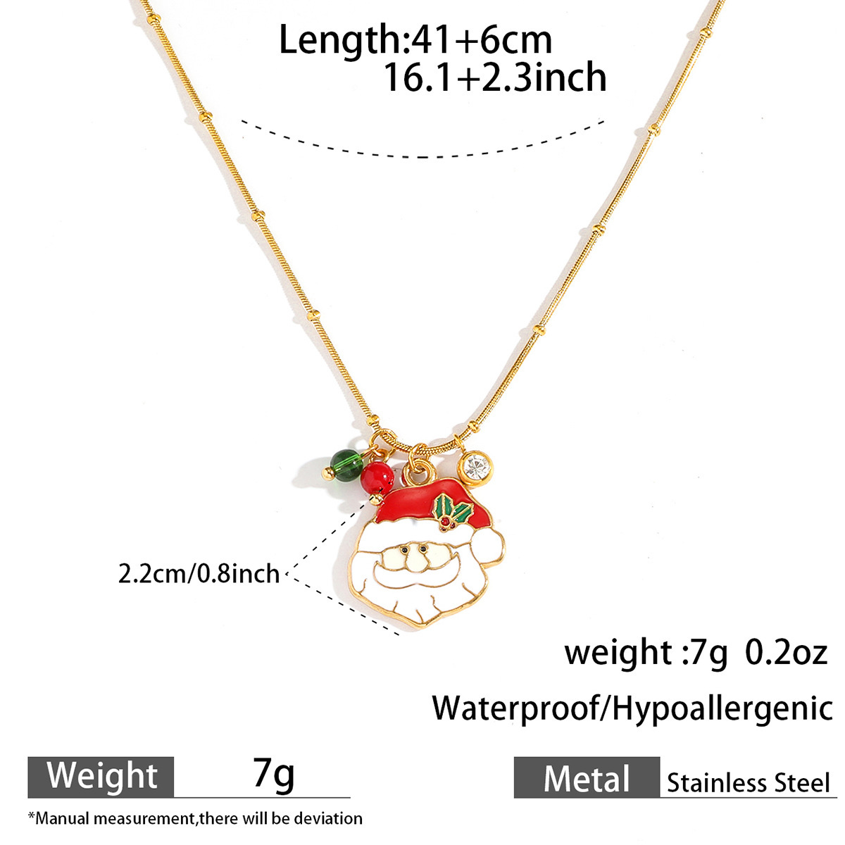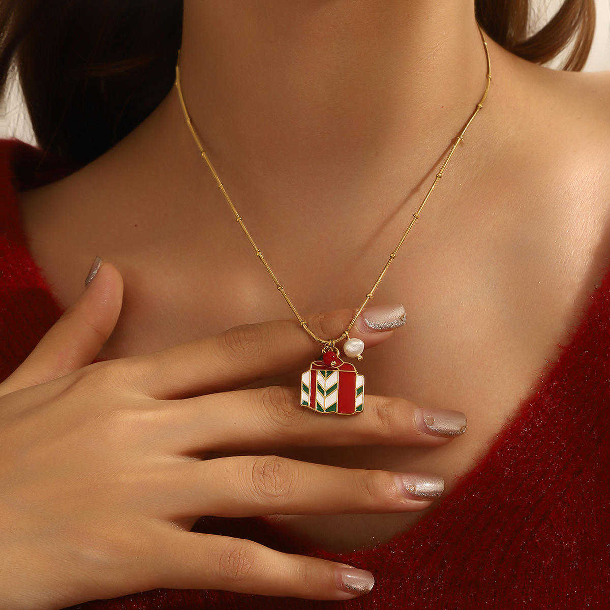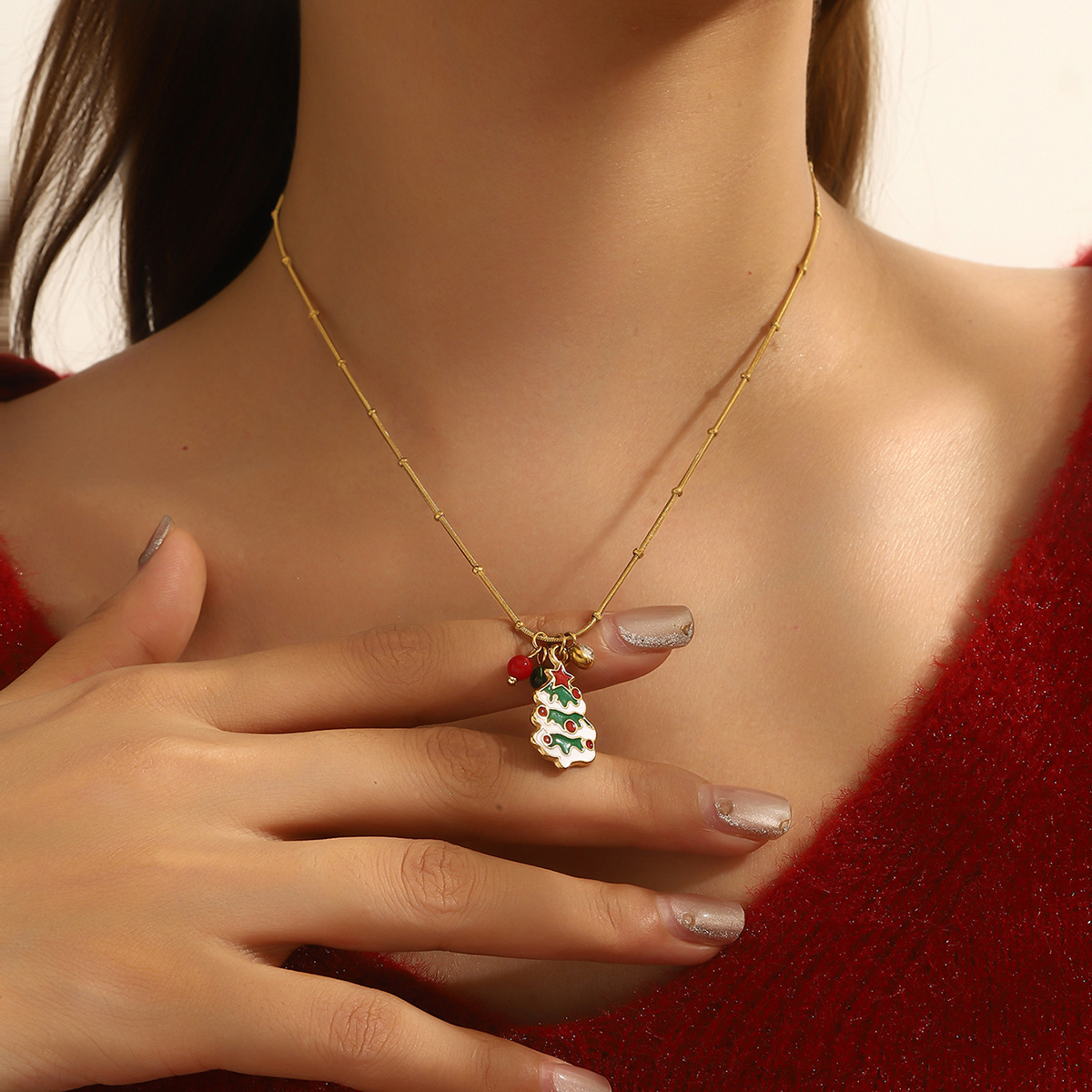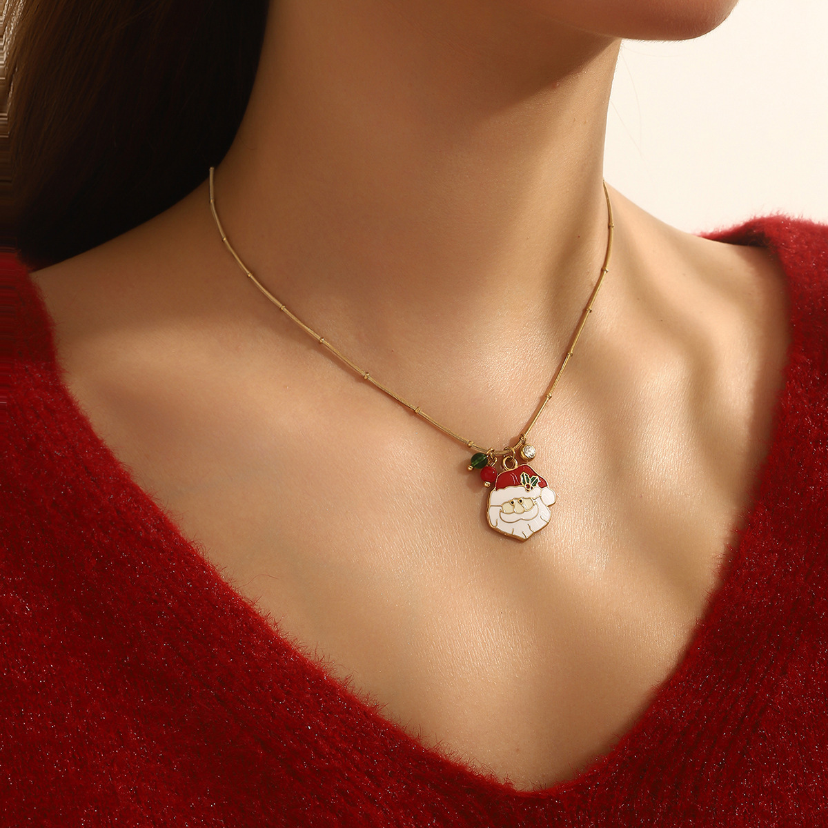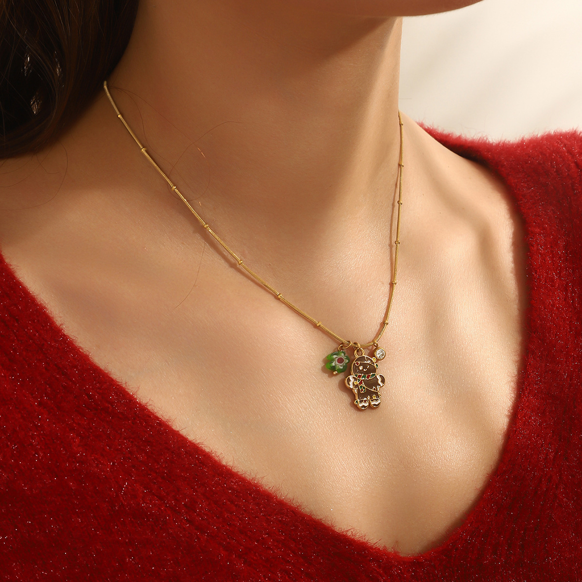 Adorn yourself with the spirit of the season using our Delicate Gold Christmas Necklace, featuring a collection of five festive charms suspended from a subtle gold chain. Each piece showcases intricate enamel work depicting classic holiday symbols including a cheerful gingerbread man, jolly Santa Claus, sparkling bell, gift box, and Christmas tree. The vibrant red and green color palette pops against the delicate gold chain, creating a perfect balance between festive joy and everyday elegance.Crafted with attention to detail, this necklace maintains a lightweight comfort ideal for all-day wear during holiday activities. The adjustable chain length allows for versatile styling, whether layered with other necklaces or worn alone as a subtle statement piece. Each charm tells a different Christmas story, making this necklace not just an accessory but a wearable celebration of holiday traditions.Perfect for Christmas parties, gift exchanges, or adding a touch of festive cheer to your everyday wardrobe. The durable gold plating ensures lasting shine throughout the season, while the secure clasp provides peace of mind during wear. ✨ An ideal gift for loved ones or a special treat for yourself, this necklace brings the magic of Christmas to any outfit with its charming details and timeless appeal.