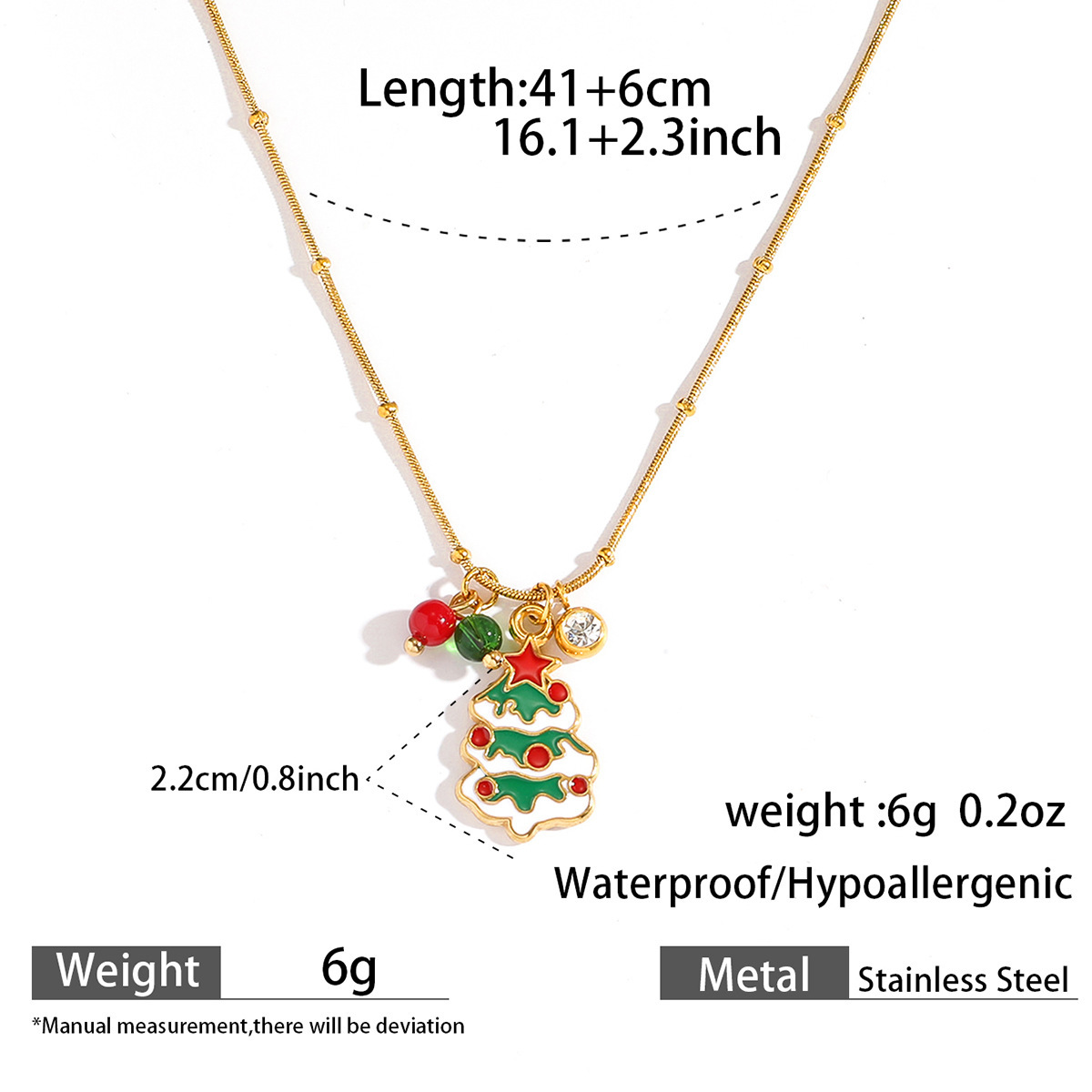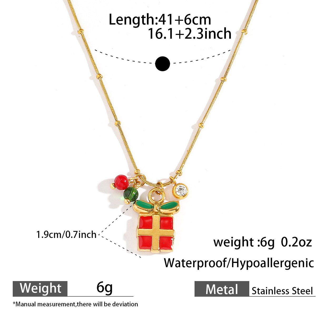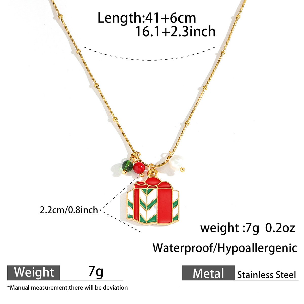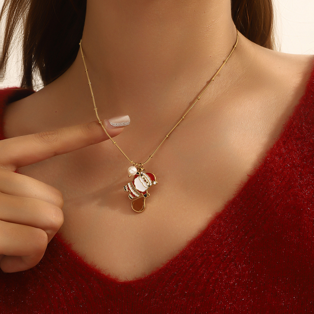 Adorn yourself with the spirit of the season using our Delicate Gold Christmas Necklace, featuring a collection of five festive charms suspended from a subtle gold chain. Each piece showcases intricate enamel work depicting classic holiday symbols including a cheerful gingerbread man, jolly Santa Claus, sparkling bell, gift box, and Christmas tree. The vibrant red and green color palette pops against the delicate gold chain, creating a perfect balance between festive joy and everyday elegance.Crafted with attention to detail, this necklace maintains a lightweight comfort ideal for all-day wear during holiday activities. The adjustable chain length allows for versatile styling, whether layered with other necklaces or worn alone as a subtle statement piece. Each charm tells a different Christmas story, making this necklace not just an accessory but a wearable celebration of holiday traditions.Perfect for Christmas parties, gift exchanges, or adding a touch of festive cheer to your everyday wardrobe. The durable gold plating ensures lasting shine throughout the season, while the secure clasp provides peace of mind during wear. ✨ An ideal gift for loved ones or a special treat for yourself, this necklace brings the magic of Christmas to any outfit with its charming details and timeless appeal.