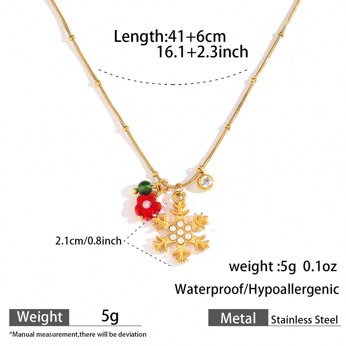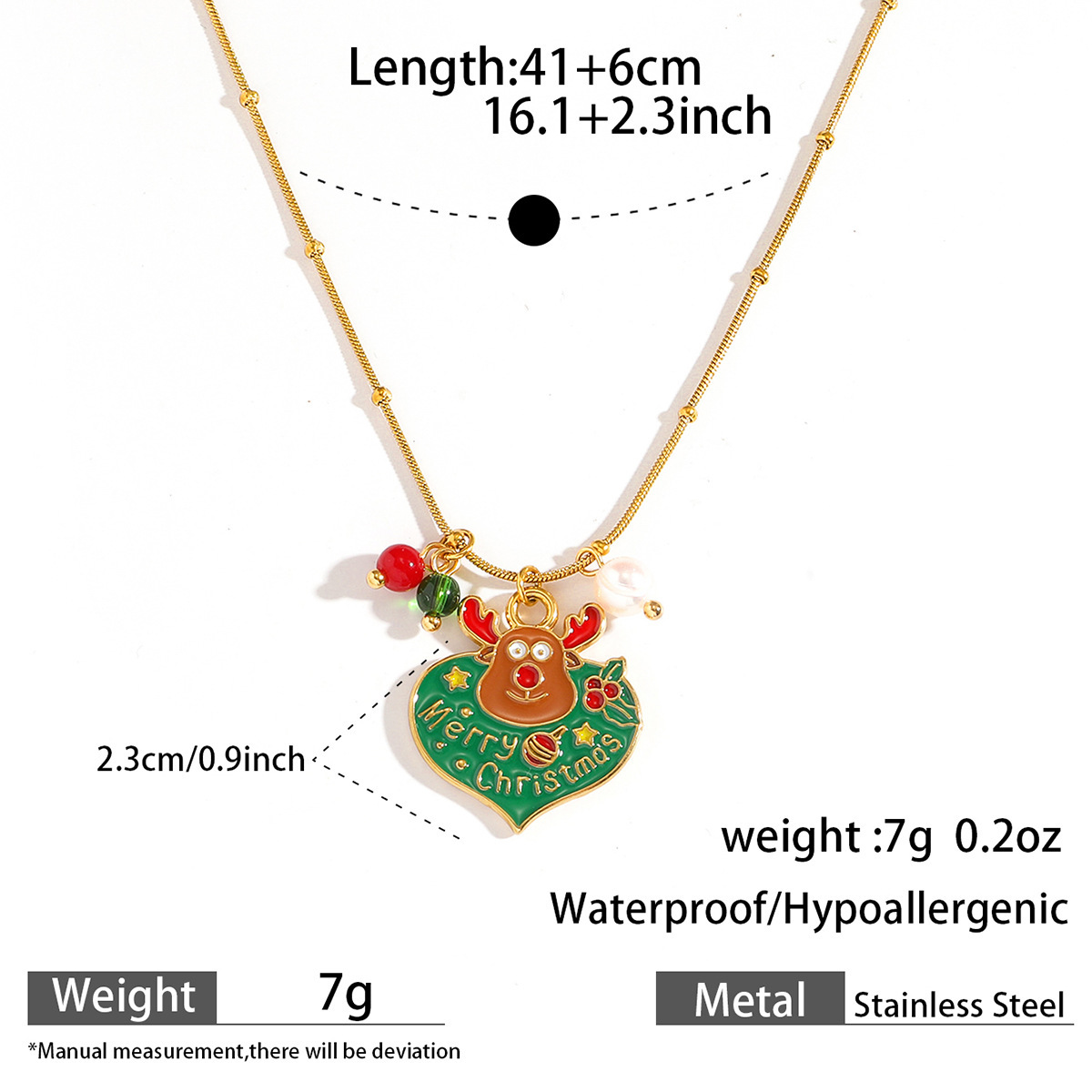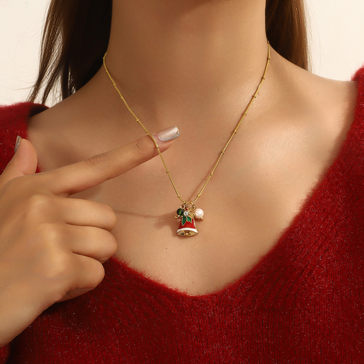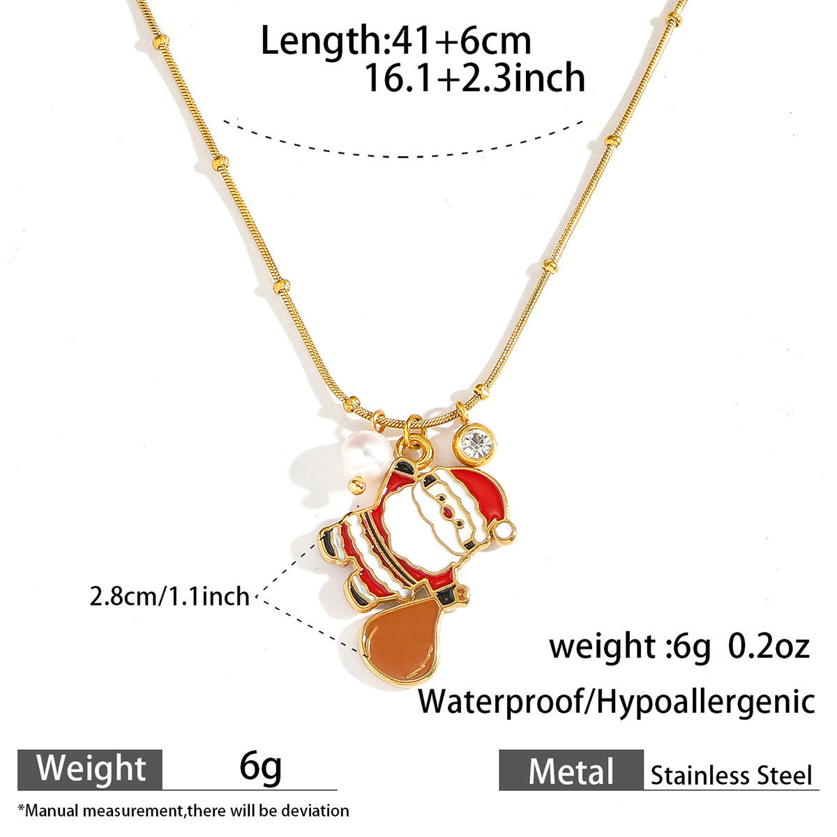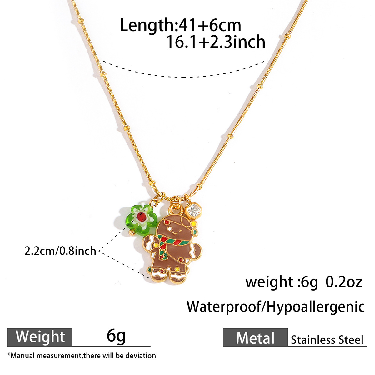 Adorn yourself with the spirit of the season using our Delicate Gold Christmas Necklace, featuring a collection of five festive charms suspended from a subtle gold chain. Each piece showcases intricate enamel work depicting classic holiday symbols including a cheerful gingerbread man, jolly Santa Claus, sparkling bell, gift box, and Christmas tree. The vibrant red and green color palette pops against the delicate gold chain, creating a perfect balance between festive joy and everyday elegance.Crafted with attention to detail, this necklace maintains a lightweight comfort ideal for all-day wear during holiday activities. The adjustable chain length allows for versatile styling, whether layered with other necklaces or worn alone as a subtle statement piece. Each charm tells a different Christmas story, making this necklace not just an accessory but a wearable celebration of holiday traditions.Perfect for Christmas parties, gift exchanges, or adding a touch of festive cheer to your everyday wardrobe. The durable gold plating ensures lasting shine throughout the season, while the secure clasp provides peace of mind during wear. ✨ An ideal gift for loved ones or a special treat for yourself, this necklace brings the magic of Christmas to any outfit with its charming details and timeless appeal.
