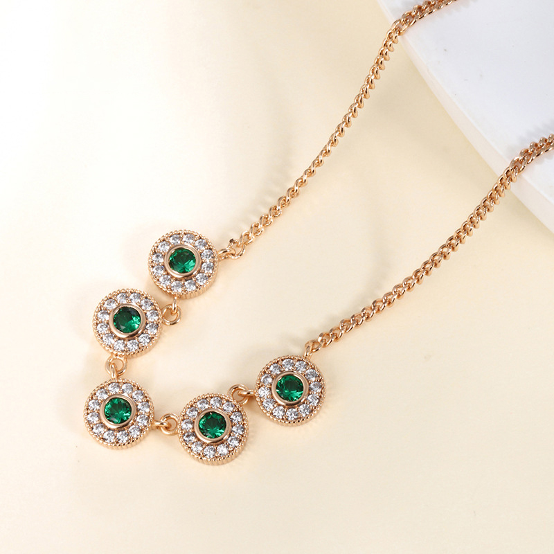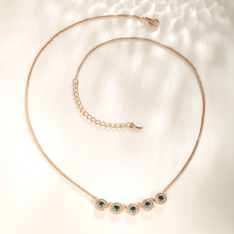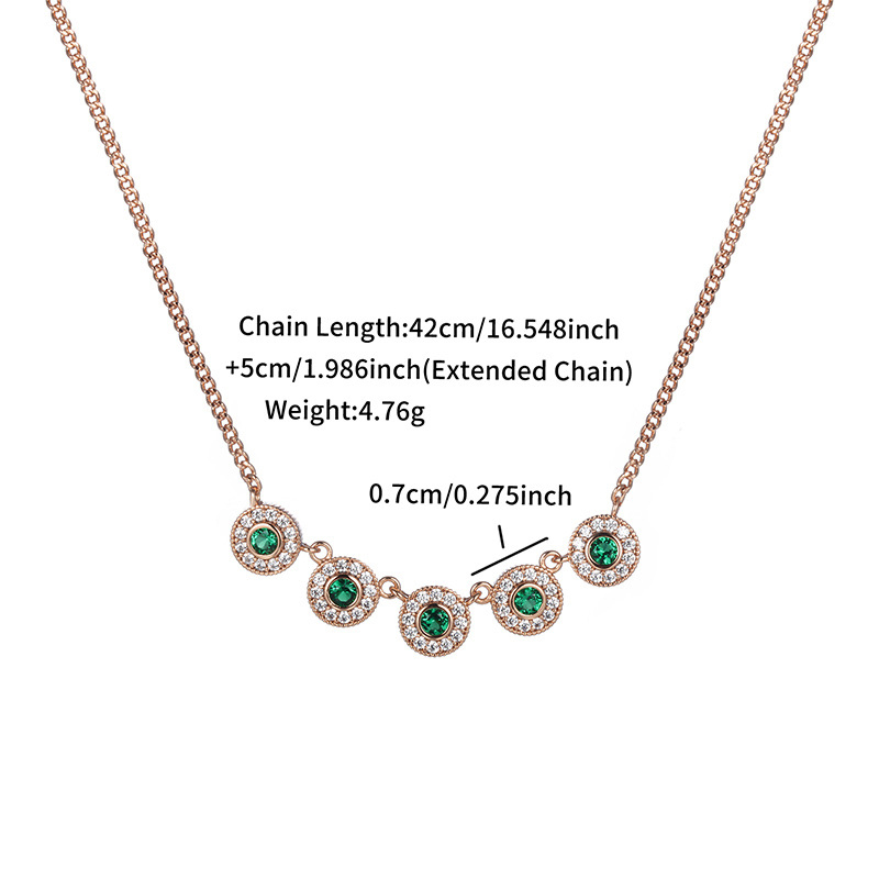 Delicate Halo Details Each small disc is framed with a fine halo of clear crystals, creating a balanced shimmer that feels elegant without appearing overpowering. Thoughtfully Arranged The repeating disc design forms a gentle, symmetrical flow across the collarbone, making the necklace feel refined, considered, and effortlessly wearable. Everyday Versatility Finished in a warm gold tone, this necklace pairs easily with open necklines, knitwear, or layered chains—ideal for daily styling or subtle evening polish.THE SPECS