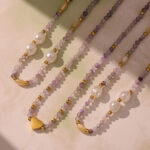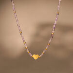 Embrace understated elegance with our delicately hand-strung choker. Inspired by the effortless chic of French style, this necklace combines irregular, earthy natural stones in soft lavender and beige with luminous gold-toned beads and a timeless heart-shaped charm. Each piece is uniquely crafted, ensuring no two are exactly alike.