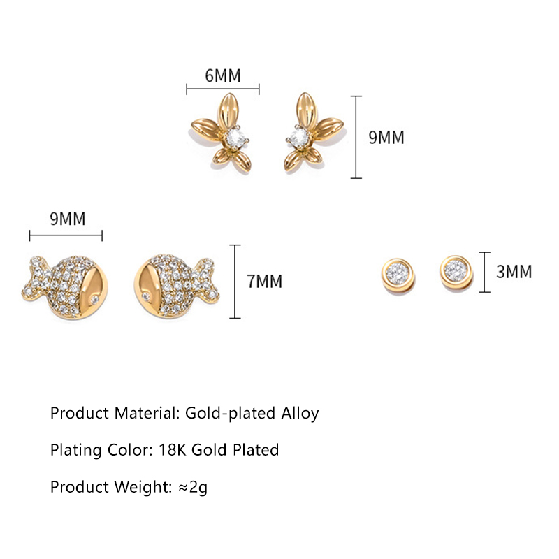 Curated Variety Why settle for just one? This set includes three complete pairs of earrings, giving you the freedom to style them together or separately for a personalised, effortless ear look. Charming Motifs The Fish: A playful symbol of good fortune and positivity, finished with pavé-set crystals for gentle sparkle. The Flower: A delicate floral design inspired by nature, detailed with a central crystal for soft shine. The Dot: A timeless round crystal set in a clean, minimalist style— perfect for everyday wear. Perfectly Petite Designed in small proportions, these lightweight studs sit comfortably on the ear, making them ideal for all-day wear and for those who prefer a more delicate, understated look.THE SPECS