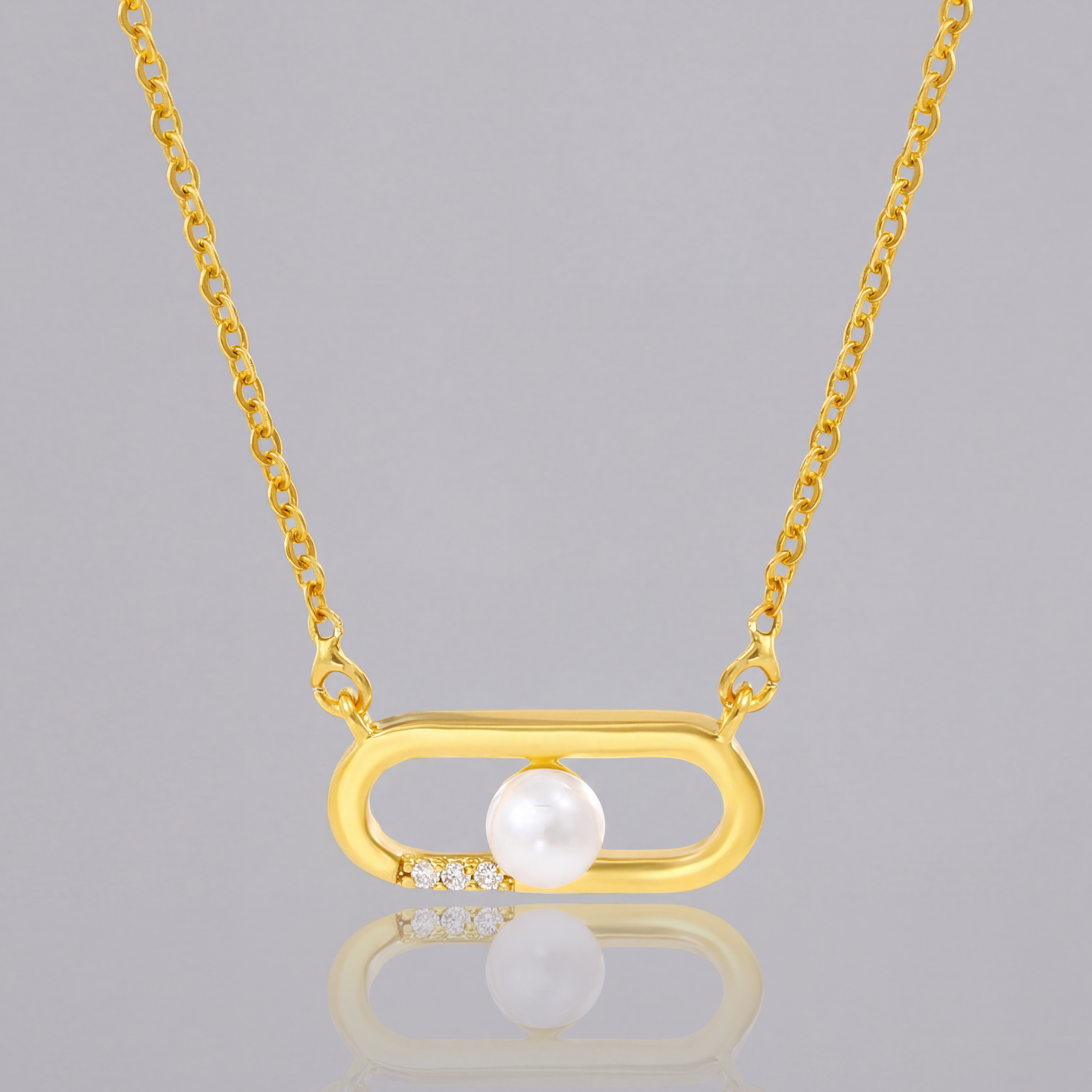 Architectural Detail The pendant features a refined oval form inspired by the paperclip motif, accented with subtle crystal details that introduce a soft, considered shimmer without overwhelming the design. Designed for the Collarbone Finished with a shorter chain length, the necklace sits neatly at the base of the neck— ideal for open collars, fine knits, or effortless layering. Warm Gold-Tone Finish Completed in a rich, 24K-inspired gold tone, the smooth surface carries a saturated warmth that contrasts beautifully with the soft glow of the pearl. Lightweight Comfort Delicately crafted for everyday wear, this necklace feels light on the skin and comfortable from morning through evening.THE SPECS
