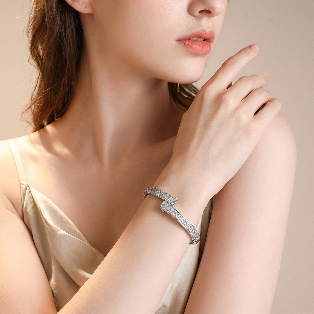Geometric Elegance Breaking away from traditional round bangles, the clean lines of the pavé-set rectangular bars introduce a sharp, modern character while remaining refined and effortlessly wearable. Seamless Fit Designed with a discreet hinged mechanism and secure clasp, the bangle opens smoothly for easy wear and closes confidently in place— no forcing or squeezing required. Cool Silver-Tone Finish The polished silver-tone surface delivers a bright, mirror-like shine that pairs effortlessly with minimalist jewellery or more statement-led pieces.THE SPECS