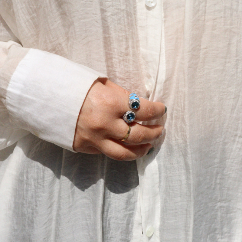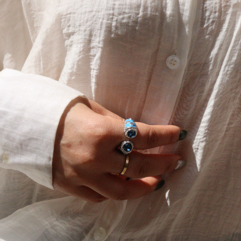 The Sapphire Reef Glow Ring is a radiant homage to the mysterious beauty of deep ocean reefs — sculpted in a bold Klein blue, illuminated by hand-placed crystals, and finished with artful enamel detailing. Every curve whispers craftsmanship, every shimmer tells a story.
