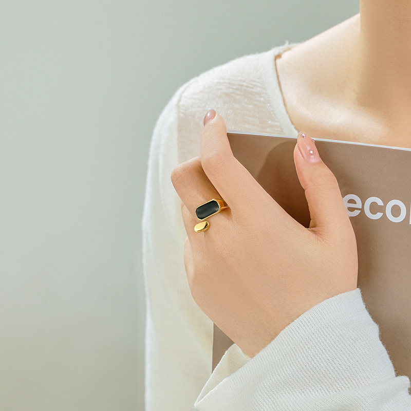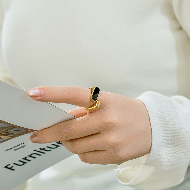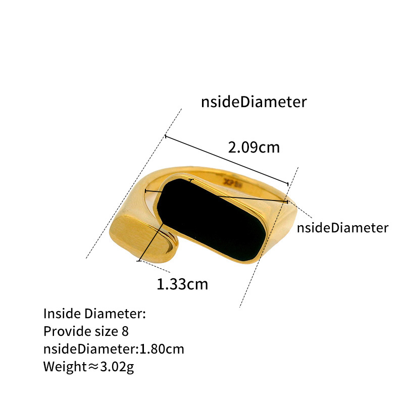 Everyday Durability Crafted from stainless steel with a warm gold-tone finish, this ring is designed to handle daily wear with ease, offering lasting shine and low-maintenance comfort. Modern Signet Design Inspired by traditional signet rings, the bold band is reimagined with an open structure, balancing a strong visual presence with a lighter, more contemporary feel. Graphic Contrast A deep black rectangular inlay creates a clean, architectural contrast against the gold-tone metal, giving the ring a confident yet understated edge.THE SPECS