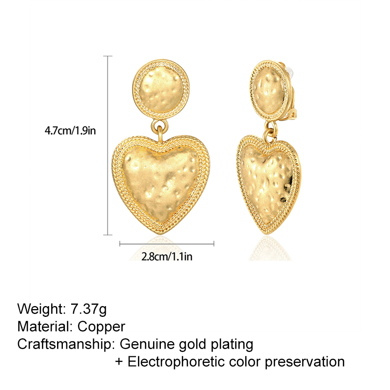 Embrace timeless elegance with The Victoria Heart Drop Earrings, featuring delicately sculpted heart pendants suspended from classic shepherd hook backs. Crafted from premium copper with luxurious 24K gold plating, these earrings showcase a perfect blend of vintage inspiration and modern craftsmanship. The advanced electrophoresis color protection technology ensures the rich gold finish maintains its brilliance through daily wear, while the 7.8g weight provides a substantial feel without compromising comfort.Each heart-shaped pendant displays intricate dimensional details that catch the light beautifully, creating a soft shimmer with every movement. The elegant drop design elongates the neckline while maintaining a sophisticated proportion suitable for both daytime refinement and evening glamour. The shepherd hook backing offers secure yet comfortable wear, making these earrings ideal for all-day elegance.Perfect for romantic occasions, anniversary celebrations, or as a special gift, The Victoria Heart Drop Earrings bring a touch of Victorian romance to modern styling. The combination of 24K gold plating and electrophoresis protection delivers exceptional color retention, ensuring these earrings remain a cherished part of your jewelry collection for years to come.