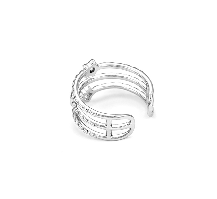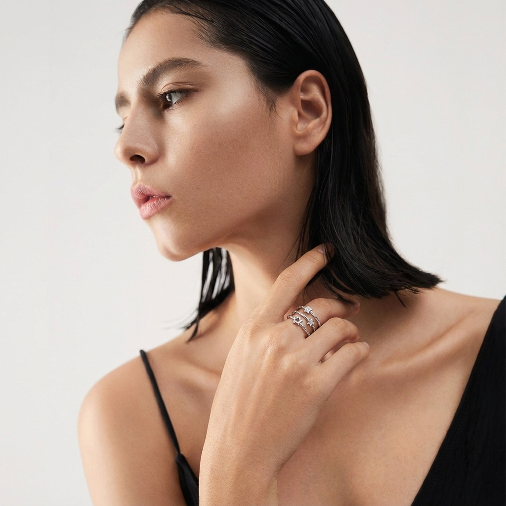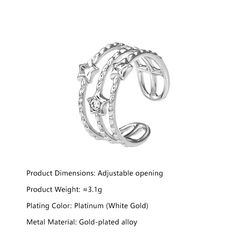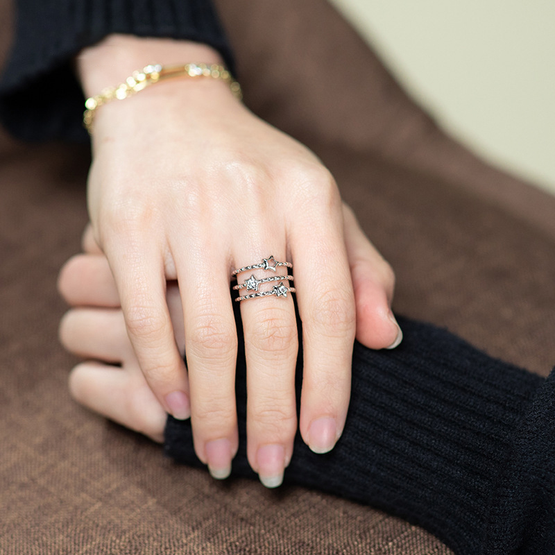 Instant Layering The multi-row silhouette creates the appearance of three perfectly spaced rings while staying neatly in place, so your stack always looks intentional and well balanced. Celestial Detail Three petite star motifs, each accented with a subtle crystal, add a touch of night-sky sparkle to this modern, easy-to-wear design. Comfortable, Adjustable Fit Finished in a polished silver tone, the open-back design allows for gentle flexibility. While the wider profile offers a secure, snug feel, it remains comfortable enough for all-day wear.THE SPECS