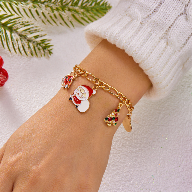 The rich gold-toned finish complements the vibrant enamel colors, creating a warm, festive appearance that pairs beautifully with both casual and formal holiday attire. Designed for lasting wear, the zinc alloy construction maintains its luminous finish throughout seasonal celebrations while the secure clasp ensures reliable wear. Perfect for Christmas gatherings, gift exchanges, or adding festive cheer to everyday outfits, this character-filled bracelet brings childhood magic to your wrist.