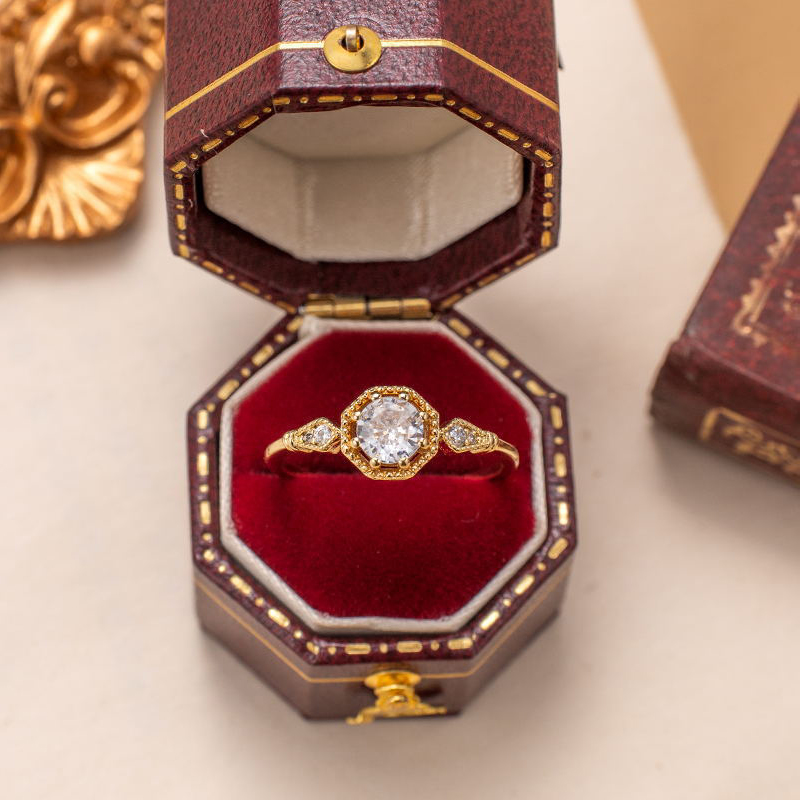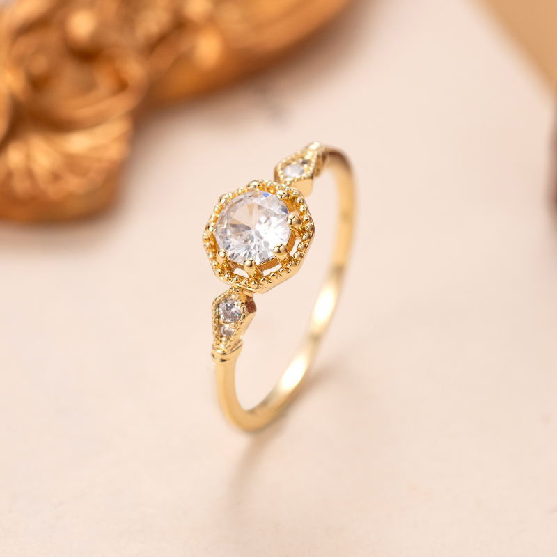 A vintage-inspired gold ring set with shimmering zirconia, designed to catch the light with every movement. Elegant yet understated, perfect for adding a touch of timeless sparkle to your everyday look.