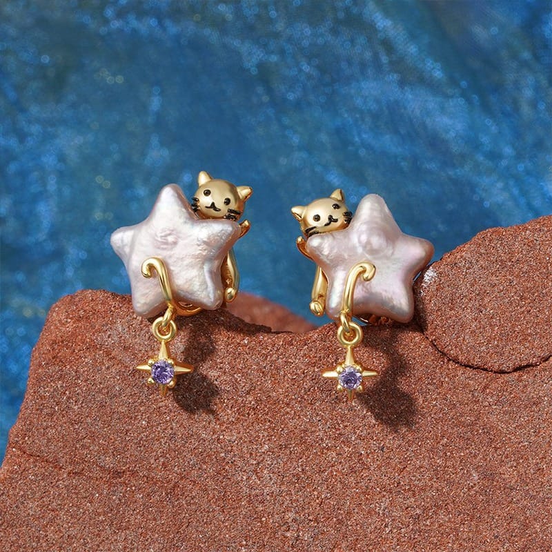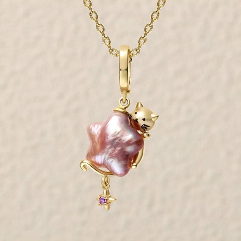 Whimsical Cat & Star Baroque Pearl Jewelry Set – Necklace & Earrings